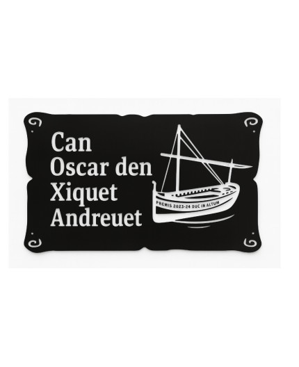 Original letrero pergamino realizado en Forja modelo “Cn Oscar den Xiquet Andreuet” en color óxido.